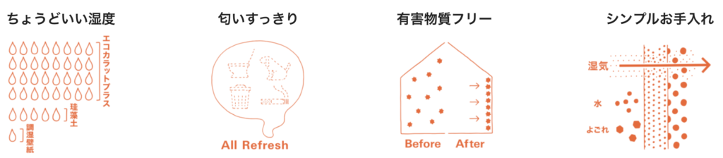 エコカラットは素材の微細な孔が自然に湿気を吸ったり吐いたりすることで、電気などのエネルギーを使わず、カラッと快適にすごせます。